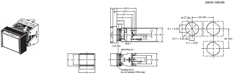 Select the Plug that fits the panel design and mount from the front of the Panel. Panel cutouts are the same as those for Switches.