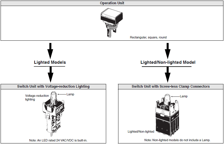 The model numbers used to order sets of Units are illustrated below. One set comprises the Pushbutton, LED (lighted models only), Case, and Switch. For information on combinations, refer to Ordering Information on below.