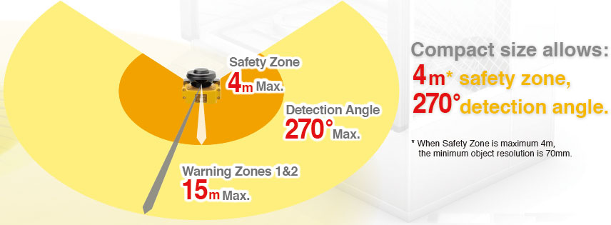 For complex AGV applications, up to 70 combinations - each with one safety zone and two warning zones - can be set. The two warning zones can be set to support various purposes such as warning sound and speed control.