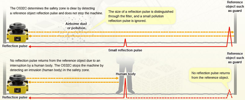 The OS32C constantly monitors reference points and turns OFF the safety outputs when a shift in its position is detected.