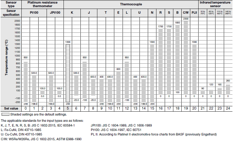 Thermocouple: K, J, T, E, L, U, N, R, S, B, C/W, or PL II Platinum resistance thermometer: Pt100 or JPt100 Infrared temperature sensor (ES1B): 10 to 70°C, 60 to 120°C, 115 to 165°C, or 140 to 260°C Analog input Current input: 4 to 20 mA or 0 to 20 mA Voltage input: 1 to 5 V, 0 to 5 V, or 0 to 10 V |