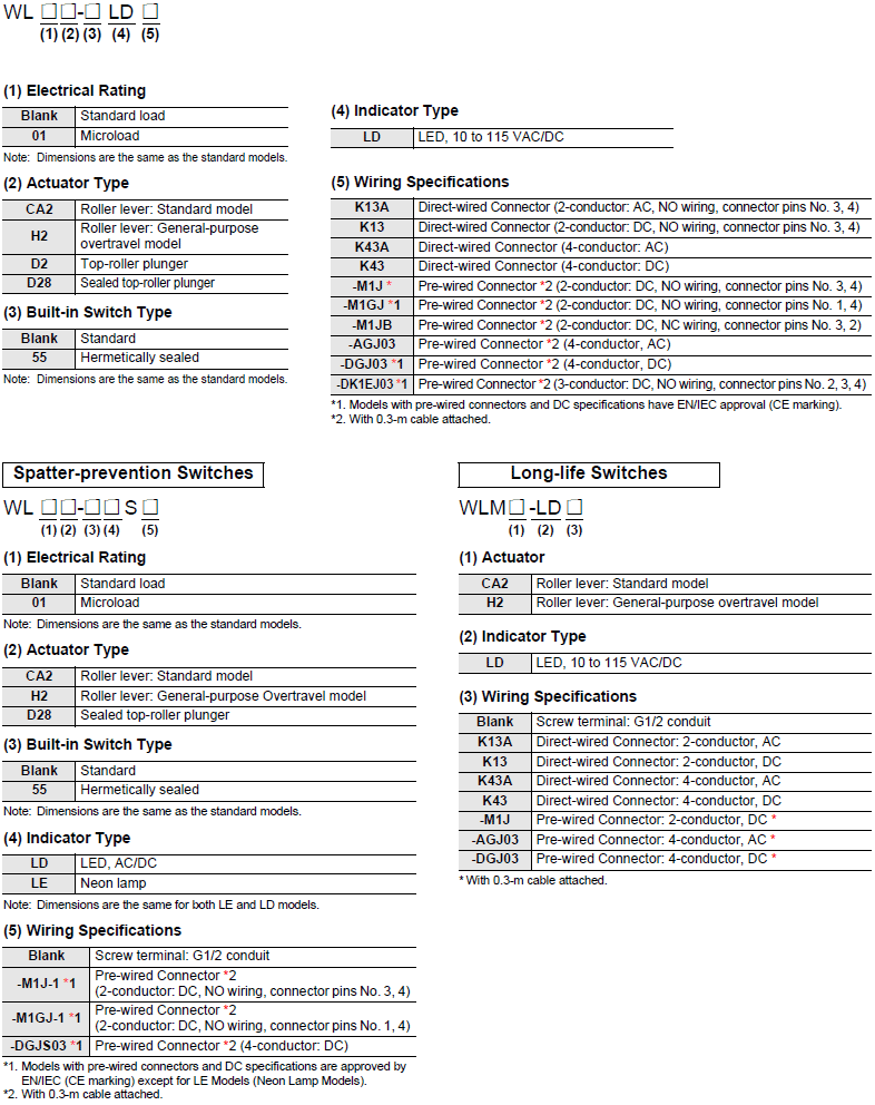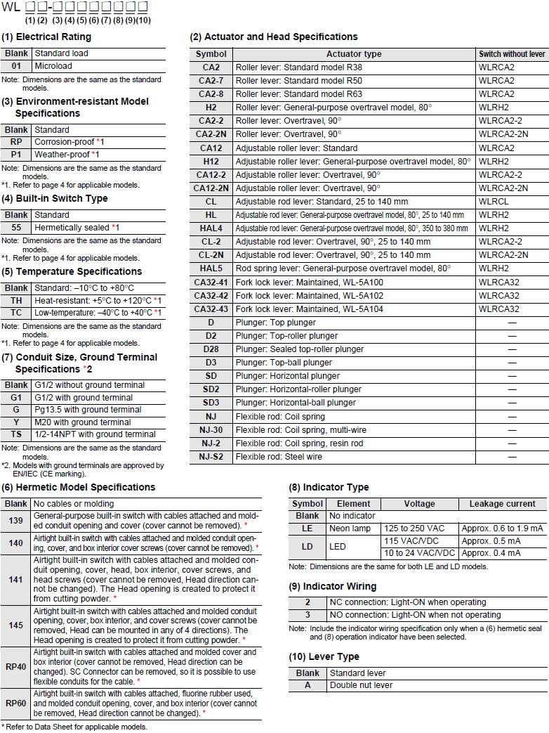 Note: For details of The WL high-sensitivity, high-precision models, refer to Limit Switch WL-N/WL Datasheet (Cat. No. C151-E1).
