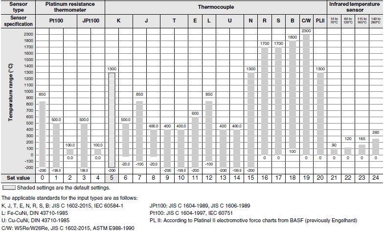 Thermocouple input (R, S, B, C/W, PL II): (±1% of indication value or ±10°C, whichever is