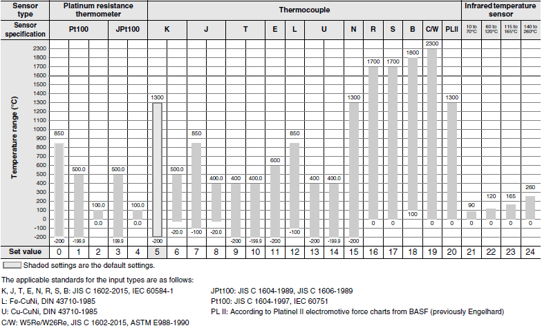 Thermocouple: K, J, T, E, L, U, N, R, S, B, C/W, or PL II Platinum resistance thermometer: Pt100 or JPt100 Infrared temperature sensor (ES1B): 10 to 70°C, 60 to 120°C, 115 to 165°C, or 140 to 260°C Analog input Current input: 4 to 20 mA or 0 to 20 mA Voltage input: 1 to 5 V, 0 to 5 V, or 0 to 10 V |