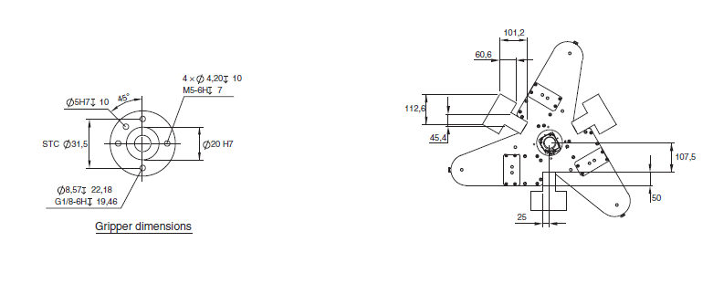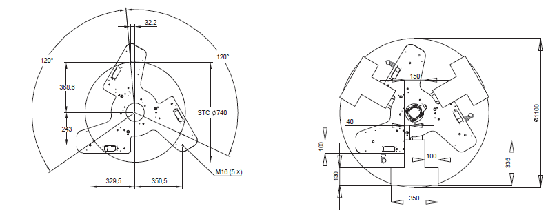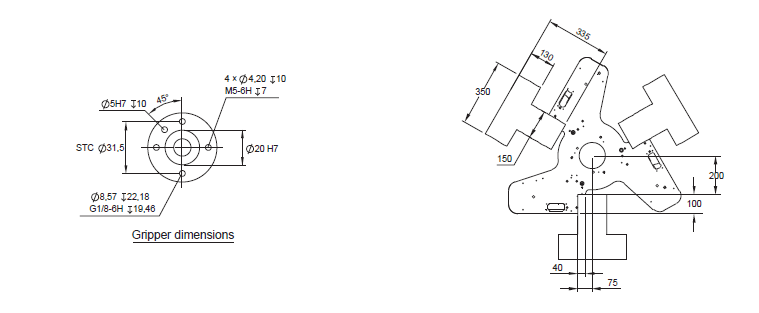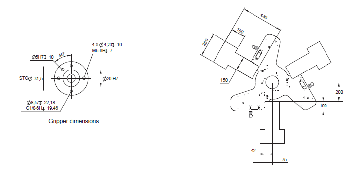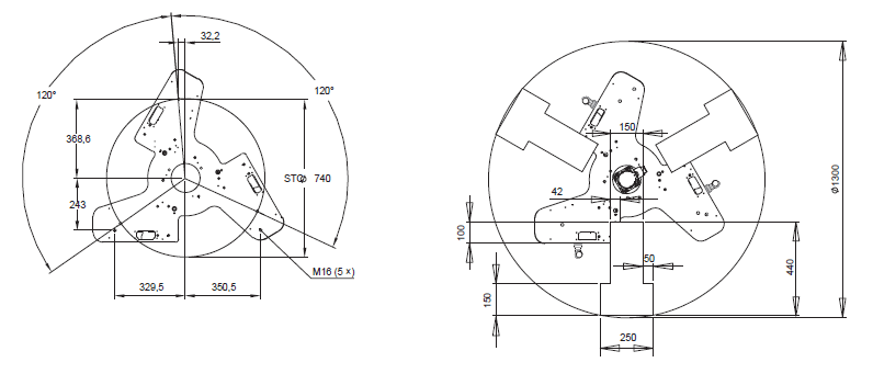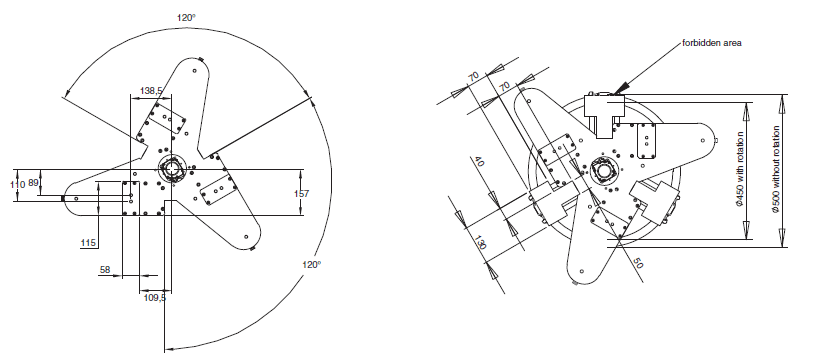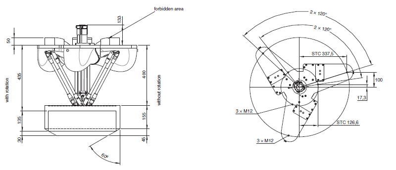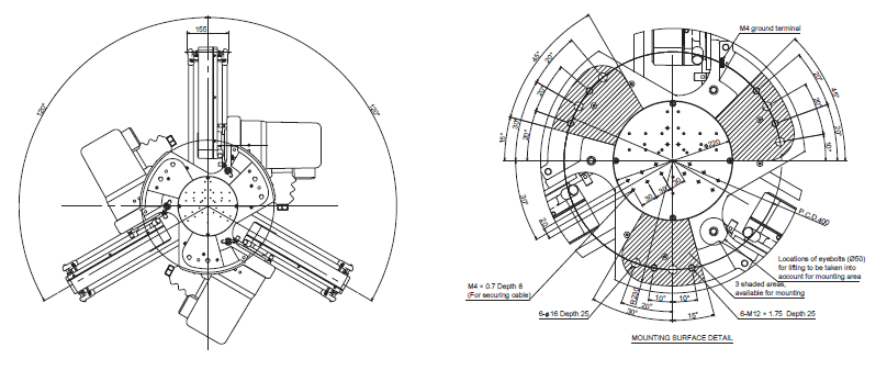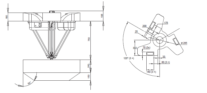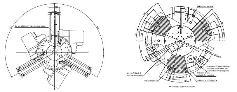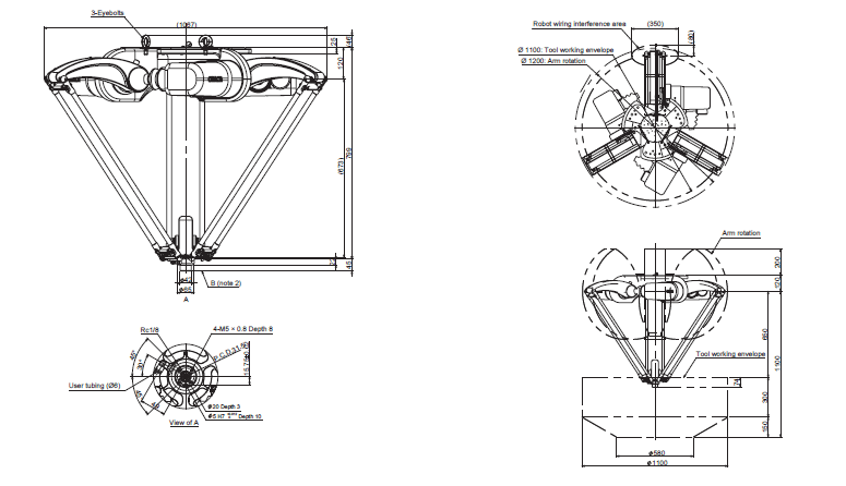 The three areas of the robot base are available for mounting. Leave other area unoccupied for other needs (e.g. writing). Also note the locations of the eyebolts when designing a mounting frame. Any part of end-effector should not stick out above the surface of B.