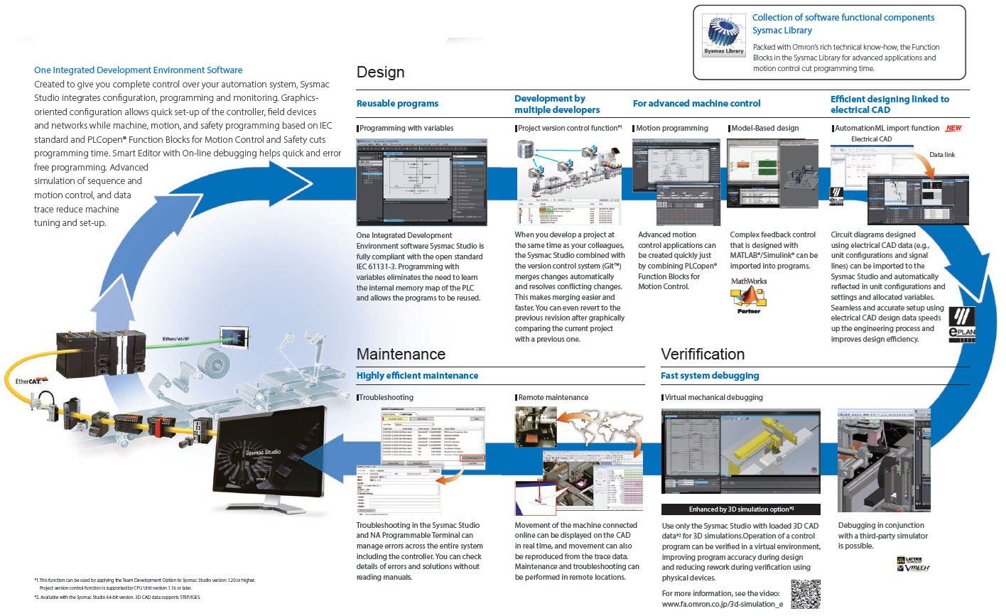 Created to give you complete control over your automation system, Sysmac Studio integrates configuration, programming and monitoring. Graphicsoriented configuration allows quick set-up of the controller, field devices and networks while machine, motion, and safety programming based on IEC standard and PLCopen® Function Blocks for Motion Control and Safety cuts programming time. Smart Editor with On-line debugging helps quick and error free programming. Advanced simulation of sequence and motion control, and data trace reduce machine tuning and set-up.