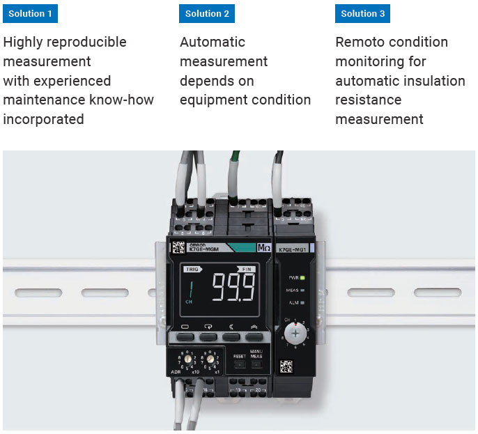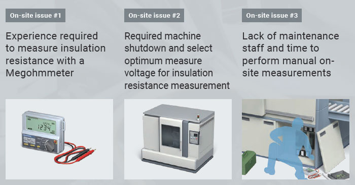 Since measuring insulation resistance requires stopping the equipment power to remove the wiring, there are many hurdles to increasing measurement frequency, such as production adjustment, securing of resources or person-hours to conduct on-site measurement, etc.