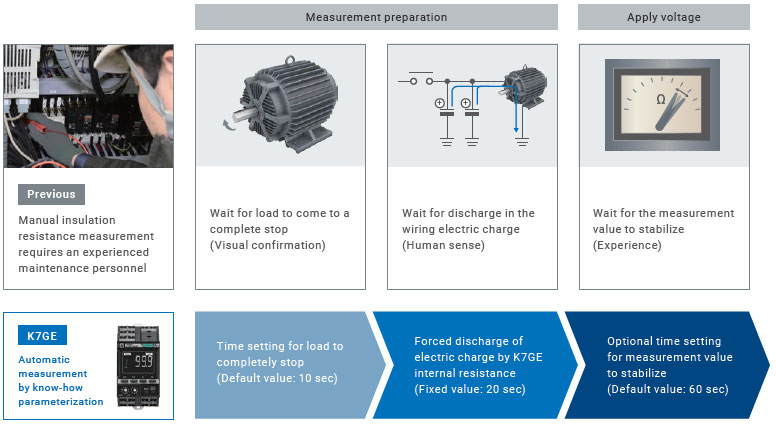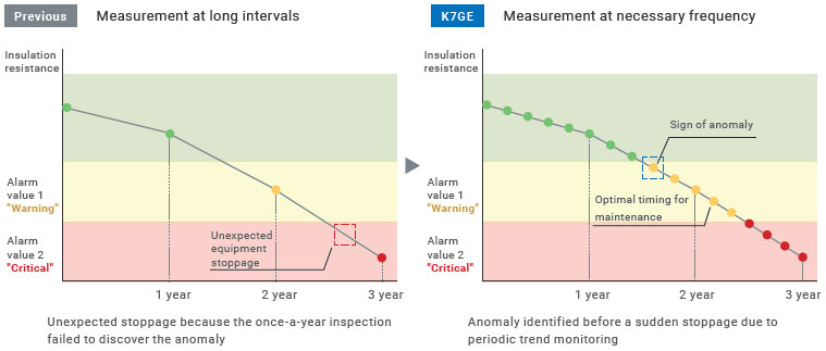 K7GE allows for automatic measurement during a short equipment downtime, enabling measurement at the necessary frequency to help avoid sudden stoppages due to insulation degradation which conventional inspections conducted at long intervals may miss.