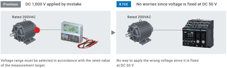 Conventional measurement with a typical Megohmmeter requires selecting a voltage range in accordance with the measurement target, with the risk of breaking down the equipment target of measurement if a wrong range is selected. With K7GE, there is no way to measure with the wrong voltage range since the voltage to be applied to the measurement target is fixed at DC 50 V. In addition, even when measuring with DC50V, -You can obtain the same result as the measured value measured by applying DC500V / DC1000V with a megohmmeter.