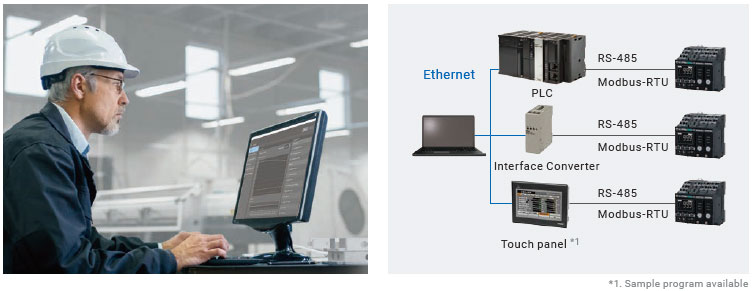 K7GE allows for remote monitoring from the office via network connection using a touch panel, PLC, and communications converter.