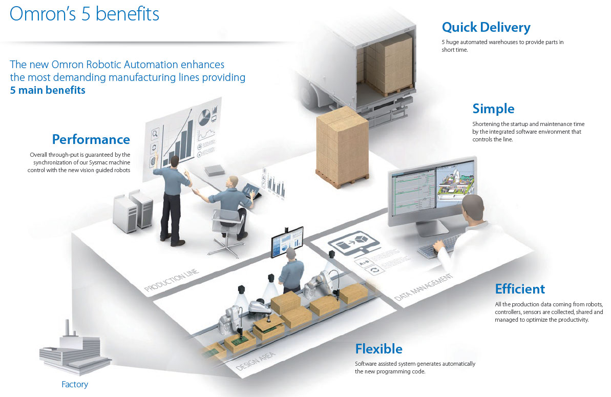• EtherCAT connectivity to the Omron NJ501-R controller and programming through the familiar IEC 61131-3 programming language or scripting (eV+).