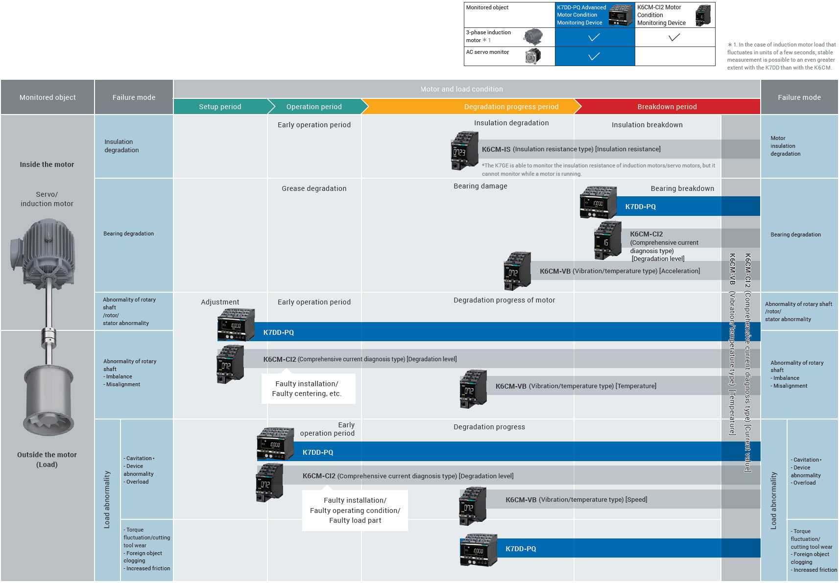 OMRON's condition monitoring devices for motor include the K6CM motor condition monitoring device and the K7GE-MG insulation resistance monitoring device. These application coverage and effects of these devices vary, so use the respective devices that are suited to your equipment and the applications you want to run. With the K7DD, you can select the effective feature values for each failure mode and failure part, enabling failure parts to be identified.