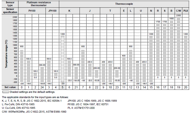 Thermocouple: K, J, T, E, L, U, N, R, S, B, C/W, or PL II Platinum resistance thermometer: Pt100 or JPt100 Analog input Current input: 4 to 20 mA or 0 to 20 mA Voltage input: 1 to 5 V, 0 to 5 V, or 0 to 10 V |